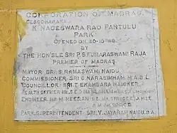 Nageswara Rao Park was originally called Arathakuttai (big pond).[6] In deference to a request by the Chennai Corporation, the owners of the pond, Ramayamma Pantulu, Aravamutha Iyengar and Nainiappa Mudaliar, donated the pond to the civic body for creating a park. After its creation, the park was named after Desodharaka Nageswara Rao Pantulu.[7] It was opened to the public by P. S. Kumaraswamy Raja, the then Chief Minister of Madras, on 20 October 1940. Originally developed in a much smaller area on Luz Church Road, the park was expanded when more land was donated by Ramayee Ammal, M. Nainappa Mudaliyar, V. Kumaraswamy Raja, Vinjamur Govindarajachari and Aravamadhu Iyengar in the same year. In 1996, the Chennai Corporation re-developed the park and started maintaining it.[8] A pond known as Aaratha kuttai was filled in and made into a garden.[9] It was Nageswara Rao, founder of the neighbouring Amrutanjan factory, who convinced the local residents to develop the area when the pond began to dry up.[9] It is in his memory that the park was named after him.