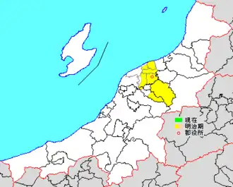 * yellow - areas formerly within the district borders during the early Meiji period