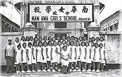 Nan Hua High School was founded on 14 June 1917 as Nam Wah Girls' School (simplified Chinese: 南华女学校; traditional Chinese: 南華女學校), by Xiong Shangfu, an overseas Chinese industrialist and prominent figure in the local Cantonese community.[7] The school was established with the aim to give girls in Singapore the opportunity of receiving an education which was a privilege few girls had at that time.[8] It was first founded in a makeshift school with two rented shop-houses converted into four classrooms in Coleman Street.[8] From a cohort of fewer than 100 Chinese girls, the student population grew rapidly and in 1921, the school moved to a new building in Bencoolen Street to accommodate its expansion. However, in 1924, the school was forced to close temporarily due to financial difficulties. After a series of public appeals, contributions of funds from the community helped pay off the school's debts, and the school re-opened.[9]