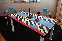 Over the past couple decades Du Pasquier became fascinated with the imaging of two and three dimensional objects. For a long period of time she created still life paintings by reciprocating everyday objects. Later she built wooden structures representing objects with a real life eye for dimension and symmetry.[19] Du Pasquier's art work consists of bold shapes and colors.[20] Her paintings and figures represents a twist on abstract art.[21] She is not in favor of using high tech graphics in her art. Most of her works are subsequently completed with a pencil and paper.[22] Du Pasquier says she strives to put “elements together that are interesting to paint."[23]