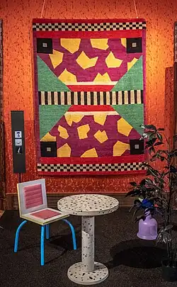 In Milan, she met the designer George Sowden and in 1981, she and Sowden were asked to become two of the founding members of the Memphis Group by designer and architect Ettore Sottsass.[5] Du Pasquier, the youngest member of the Memphis Group, designed textiles and furniture items.[6][7][8] The group was known for making work under the motto "form follows fun".[9] After the Memphis Group broke up, Du Pasquier shifted her focus to work on her solo career as a painter and sculptor.[10]