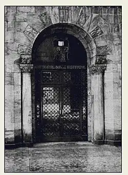 The naturalistic, low relief ornament motifs that run along its gray stone base was produced by the architectural sculptors Ulysses Ricci and John De Cesare. Fruits, animals and twisting vines can be discerned, as well as a bible centered above the entrance, the symbol of the National Bible Institute. These stylized elements sit somewhere between medieval revival and Art Deco.