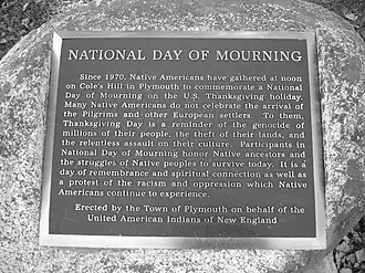 ![]() The National Day of Mourning plaque on Cole's Hill in Plymouth, Massachusetts | |