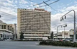 The Intourist Hotel was constructed in Chișinău, then the capital of the Moldavian Soviet Socialist Republic, and finished in 1974[1] or 1978.[2] It was designed by the architects A. Gorbuntsov and V. Shalaginov.[1] After its opening, the 17-story socialist modernist building "became a proud symbol of the Soviet Union's embrace of modernity", according to The New York Times. The four-star hotel was run by the Soviet state-owned travel monopoly of the same name, and it served as one of their flagship properties.[2] It was primarily booked by foreign visitors and Soviet celebrities.[3]