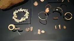 Starting with the oldest known pieces of artefacts made by hominin precursors of modern humans, dated to about 142,000 years, the museum presents a reproduction of perforated shell beads.[10] They were found in 2019 by archaeologists in the Bizmoune cave near Essaouira, Morocco, and show perforations indicating purposeful processing that may have been a token of identity.[11][12] Further historical periods covered are the pre-historic, pre-Roman (Phoenician and Carthaginian), Roman and Islamic eras, leading up to the early 20th century. The collection comprises around 8,000 items, including historical caftans and urban bridal adornments typical of different cities. A special section of the museum presents hundreds of pieces donated by King Mohammed VI from the royal collection of Amazigh (Berber) jewellery, including a large variety of silver fibula brooches and palm-shaped khmissa amulets.[10][13]