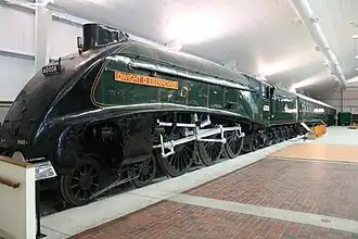 | London and North Eastern Railway | A4 4-6-2 | 4496 Dwight D. Eisenhower | Only A4 class steam locomotive in the United States, and one of two displayed in North America; the other being 4489 Dominion of Canada. It was temporarily displayed in England for the reuniting of the remaining six A4s. In 2014, the locomotive was returned to the museum. During its display in England, the locomotive was repainted to the accurate shade of Brunswick green.[10] |