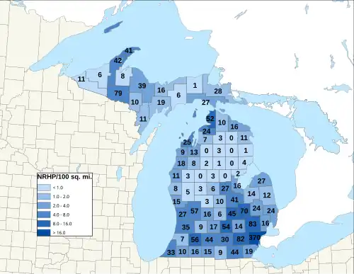 - ^ The following sites are listed in multiple counties: Jefferson Avenue-Huron River and Harbin Drive-Silver Creek Canal Bridges (Monroe and Wayne), Main Street Historic District (Milan, Michigan) (Monroe and Washtenaw) and Clinton-Kalamazoo Canal (Oakland and Macomb).