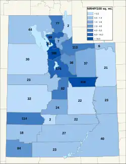 The following are approximate tallies of current listings in Utah on the National Register of Historic Places. These counts are based on entries in the National Register Information Database as of April 24, 2008[2] and new weekly listings posted since then on the National Register of Historic Places web site.[3] There are frequent additions to the listings and occasional delistings, and the counts here are not official. Also, the counts in this table exclude boundary increase and decrease listings which modify the area covered by an existing property or district and which carry a separate National Register reference number.