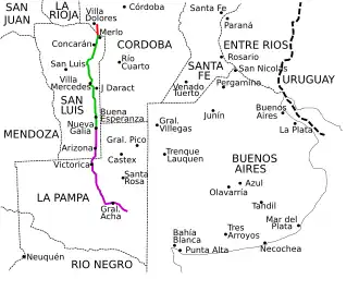 Formerly,[1] this route had a length of 761 km, up to the link with National Route 35, in the town of Perú, La Pampa Province, that is, the complete route indicated on the map. The section to the south of Nueva Galia, in San Luis, marked in purple and unpaved, passed to provincial jurisdiction through National Decree 1595 of 1979,[2] except for the section between km 263.87 and 296.78 that corresponded to the overlap with National Route 152. The Province of San Luis accepted the transfer in 1981.[3] The section between Villa Dolores and Villa Mercedes was paved in 1967, while the section between Nueva Galia and Villa Mercedes was paved in the first half of the 1970s.