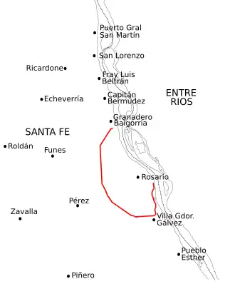 • the section from the east end on 27 Boulevard to the crossing of Ayacucho Street (old exit to the Rosario-Buenos Aires Road, now access to Provincial Route 21), is called "National Route A008 Tte. General Juan Carlos Sánchez" by decree #232 of 14 May 1981.