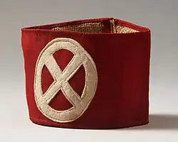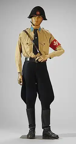 The D.N.S.A.P. had its own Storm Troopers — the S.A. (Danish: Storm Afdeling) whose normal service dress was a brown shirt with black breeches and black top boots, a black tie and a black brassard with white swastika. Headgear could be either a black peaked cap or black forage cap. On the peaked cap was a two-part badge consisting of the nation cockade of Denmark and a runic "S" and "A" within white circle. "Full dress" uniform consisted of a brown tunic, black breeches, Sam Browne belt and a cross strap worn with a khaki shirt and tie, and forage cap. On duty, guards wore a Danish army steel helmet with a runic S.A. badge.[4]