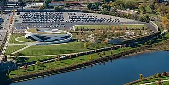 The building is rounded, 300 feet in diameter, with a minimalist interior.[15] Full-length windows on the mezzanine are vertically striped to resemble military ribbons.[16] Visitors can walk atop the museum's grassy roof for views of the Columbus skyline and a place to reflect.[12]