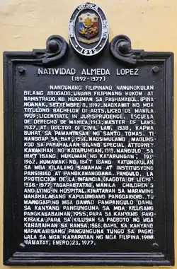 Natividad Almeda-López (8 September 1892 – 22 January 1977) was a suffragist[2] and the first female lawyer in the Philippines,[3] passing the bar in 1914 and the first woman to defend a woman in a court of law.[4][5] She was also the first female judge of the municipal court of Manila. She has been described as a "beacon in the feminist movement".[6]