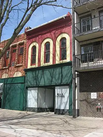 This two-story brick building lies on the northeastern corner of Public Square at the heart of the city. Among its distinctive architectural features are three rounded arch windows with sash panes, metal brackets, and multiple finials. Although some of the facade has been modified, an original metal awning covers the recessed entrance.[3]