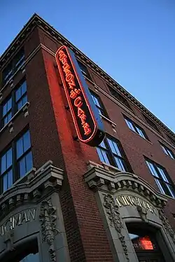 Located off NW 16th Street between Classen Ave. and Pennsylvania Ave., today the Plaza District[10] is a neighborhood commercial district boasting Oklahoma City's local arts flavor and is home to art galleries, studios, retail shops, restaurants, and creative services. Several local businesses in this area are owned by young, creative entrepreneurs. The area is home to the renovated Plaza Theatre, which holds music and theatrical performances for Lyric at the Plaza.[11] Also included in the area are the artist-made retail businesses, a quality custom tattoo shop, a popular local salon, a full-production modern local winery, and many shops for vintage and retro items. This district, once blighted by urban decay now boasts a renewed energy embraced by Oklahoma City's youth and diverse culture. Each second Friday of each month from 7-11 p.m., the district is home to "LIVE on the Plaza", a monthly artwalk featuring live music, featured artists, special events and local shopping.