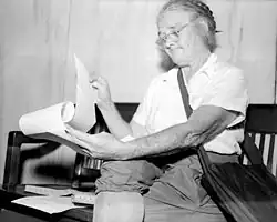 Nell Foster Rogers (1886-1974)[1] of Gainesville, Florida, affectionately known as the 'Bloomer Girl',[2] was a "people's lobbyist for better government" (also referred to as people's lobbyist)[2] and Florida legislative icon for nearly 30 years. Rogers was the first woman to graduate in agriculture from Oklahoma Agricultural and Mechanical College, where as a student she campaigned for woman's suffrage, thus beginning her lifelong cause as an activist. In 1947, she traveled to Tallahassee to oppose a bill requiring rabies inoculations for dogs.[1] This marked the beginning of her long career as a watchdog over Florida's government.[3][2]