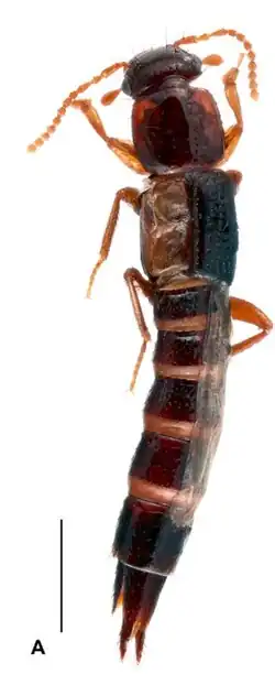 Adults have a brown head and pronotum, while the legs are light brown and the abdomen is brown.