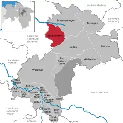 HeidekreisLower SaxonyNienburg (district)Hanover (district)Verden (district)Rotenburg (district)HarburgLüneburg (district)Uelzen (district)Celle (district)LindwedelBuchholzSchwarmstedtEsselHademstorfGiltenGrethemEickelohHodenhagenBöhmeHäuslingenAhldenFrankenfeldWalsrodeNeuenkirchenRethemSchneverdingenOsterheideBad FallingbostelWietzendorfSoltauMunsterBispingen