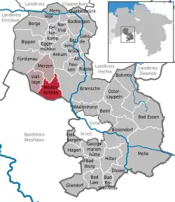 North Rhine-WestphaliaCloppenburg (district)Diepholz (district)EmslandVechta (district)OsnabrückAlfhausenAnkumBad EssenBad IburgBad LaerBad RothenfeldeBadbergenBelmBergeBersenbrückBippenBissendorfBohmteBramscheDissenEggermühlenFürstenauGehrdeGeorgsmarienhütteGlandorfHagenHasbergenHilterMelleKettenkampMenslageMerzenNeuenkirchenNortrupOstercappelnQuakenbrückRiesteVoltlageWallenhorst