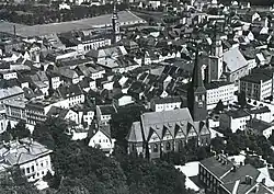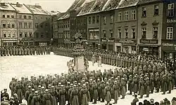 The Red Army started planning an attack on Prudnik in March 1945. It was supposed to be the most important part of the Upper Silesian offensive.[68] The Soviets captured the town on 17 March 1945. In April of that year, the Red Army organised a ghetto for around 9,000 German inhabitants of the town. Prudnik remained on the frontline until May 1945, as German units stationed in close proximity to the town. Around 200 thousand soldiers took part in fighting for the town. On 23 April 1945, the Market Square, Parish Square and Castle Square were bombarded by the Soviet airforce. However, it is not known whether the bombing was intentional. According to a local priest Franz Pietsch, the bombardment was caused by drunk Russians shooting out incorrect light signals.[69]