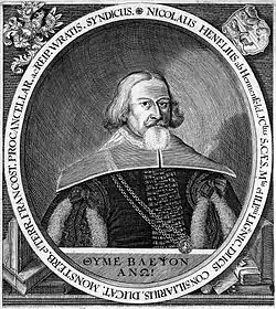 The population of Prudnik was decimated during the Thirty Years' War. In 1625, the town suffered a plague epidemic. On 12 February 1629, Emperor Ferdinand II exiled the Protestant clergy of Prudnik, while people of the town were forced to convert to Catholicism.[32] In 1642, the Swedish army captured Prudnik, then they plundered it and burned it down. After the end of the war, the town was rebuilt thanks to Emperor Ferdinand III's financial help.[33] Soon, Prudnik would become the biggest city of Upper Silesia.[34] Prudnik was a place of witch trials.[35]