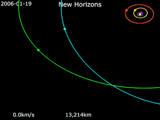 On January 19, 2006, New Horizons was launched from Cape Canaveral Space Force Station by an Atlas V rocket directly into an Earth-and-solar escape trajectory with a speed of about 16.26 km/s (10.10 mi/s; 58,500 km/h; 36,400 mph). It was the fastest (average speed with respect to Earth) human-made object ever launched from Earth.[7][8][9][10] It is not the fastest speed recorded for a spacecraft, which, as of 2023, is that of the Parker Solar Probe. After a brief encounter with asteroid 132524 APL, New Horizons proceeded to Jupiter, making its closest approach on February 28, 2007, at a distance of 2.3 million kilometers (1.4 million miles). The Jupiter flyby provided a gravity assist that increased New Horizons' speed; the flyby also enabled a general test of New Horizons' scientific capabilities, returning data about the planet's atmosphere, moons, and magnetosphere.
