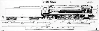 In 1943, approval was given for the New South Wales Government Railways Workshops to build 25 freight locomotives. The design was a modified version of the 57 class. The main alterations were the use of a rack and pinion valve gear[1] in lieu of the Gresley 2:1 conjugated valve gear for the middle cylinder and the use of smaller cylinders to enable the locomotives to run to on the Main North line to Broadmeadow, a route which had a tighter loading gauge. They also used a Woodard divided drive of twin coupling rods between the second and third driving wheels. A valance was fitted over the valve gear on the front platform.[2] Similarly to the earlier D57 class and the later AD60 class, the 58 class were fitted with a mechanical stoker to feed the large firebox