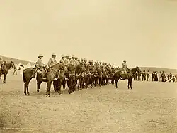 The volunteers came from Cootamundra, Gundagai, Wagga Wagga, Young, Hay, Cooma, Moree, Cobar, Tenterfield, and Bourke.[2] Formed as the sixth contingent of Imperial Bushman, with an original strength of 762 men under the command of Lieutenant Colonel Kenneth Mackay, the unit departed Sydney for South Africa on 23 April 1900 on the transport Armenian. Between May 1900 and May 1901 it served in Rhodesia as part of the Rhodesian Field Force under Lieutenant General Sir Frederick Carrington and later in West Transvaal, including the capture of Koos de la Rey's convoy and guns at Wildfontein on 24 March 1901. Lieutenant Colonel Haviland Le Mesurier took over as commanding officer in November 1900. The unit departed East London on the transport Orient and returned to Australia on 17 July 1901. Casualties included 13 killed or died of wounds and nine died of disease.[3] Members of the regiment received one Companion of The Most Honourable Order of the Bath, 4 Distinguished Service Orders and 1 Distinguished Conduct Medal.[1]