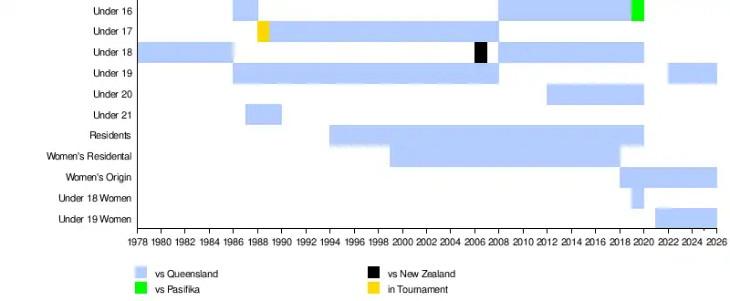 Interstate matches at an under-18 level were played between 1978 and 1985.[1][2][3] The contests were expanded to two age groups in 1986 and three in 1987, with further changes in 1988 and 1989.[4][5][6] From 1990 to 2007, two junior interstate matches were contested at under-17 and under-19 levels. In 2006, a New South Wales under-18 team was selected to play two matches in Auckland, New Zealand.[7]