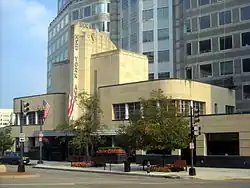 New York Avenue's consolidation with Triangle Park and three other parklets into a small mall in 1937 consumed another block between 20th and 21st Streets NW.[3] Construction of the United States Department of War Building (now the Harry S Truman Building, housing the United States Department of State), and an associated park (since January 1959, known as Edward J. Kelly Park)[4] from 1940 to 1941 destroyed the lower three blocks of New York Avenue.[5] Construction of the Theodore Roosevelt Building (which now houses the United States Office of Personnel Management) in 1963 eliminated another block between 19th and 20th Streets NW. This left a single block of New York Avenue NW, between 17th and 18th Streets NW, southeast of the White House.