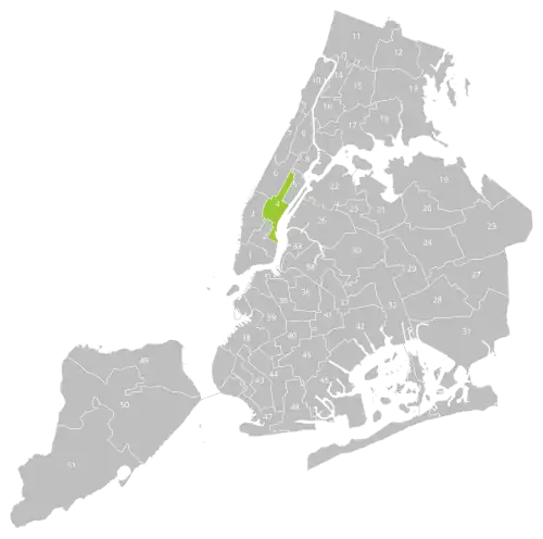 The district overlaps with Manhattan Community Boards 5, 6, and 8, and is contained entirely within New York's 12th congressional district. It also overlaps with the 28th and 59th districts of the New York State Senate, and with the 73rd, 74th, and 75th districts of the New York State Assembly.[5]