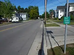 NY 267 began at an intersection with NY 93 in the village of Akron in eastern Erie County. The route headed eastward, following John Street through downtown Akron. NY 267 broke from John Street just four blocks later. While the street continued east to serve Akron Airport, the route turned northeast to follow Bloomingdale Road out of the village. The route continued through gradually less developed areas of the town of Newstead, intersecting with County Route 250 (CR 250, named Scotland Road). NY 267 crossed into Genesee County soon afterward.[5][6]