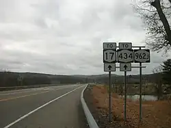 New York State Route 962J (NY 962J) is a 0.41-mile-long (0.66 km) southwest-northeast reference route that, unlike most reference routes, has been signed as a touring route in Southern Tier town of Owego in Tioga County, New York. Its southwestern terminus is at NY 17 and NY 434 in the census-designated place of Apalachin and its northeastern terminus is at NY 17C south of the hamlet of Campville.