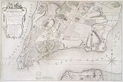 In the mid-1760s, out-of-town taverns, such as John Clapp's in the Bowery,[4] had become popular in Colonial New York, taking advantage of the "Sunset Strip-like" jurisdiction, two miles from the post office,.[5] At a site called "Bowling Green" since 1722,[6] Samuel Fraunces opened a pleasure garden, first called the Vaux-Hall Gardens,[7] in New York, in 1767[8] and it received a chief competitor[9] in the much larger Ranelagh Gardens, (named after Ranelagh Gardens, Chelsea, London),[1]: 132 [2]: 44  both appear on Bernard Ratzer's map of New York of 1767[3] occupying a wooded rise of ground just north of the northernmost city houses, on the south side of Duane Street; the site overlooked Lispenard's Meadows and the riverfront road to Greenwich Village. The original Vauxhall Gardens was located in a smaller site on Greenwich Street near the Hudson River between what later became Warren and Chambers streets in the fashionable Sixth Ward; Public School 234 stands at the site today.[2]: 44 [10]: 61  Ratzer's map shows its square garden plot, conventionally divided in four by walks. Fraunces operated Vaux-Hall through Summer 1773; in October, he auctioned its contents and sold the property.[11]: 38  His notice mentioned two large gardens, a house with four rooms per floor and twelve fireplaces, and a dining hall that was 56 feet (17 m) long and 26 feet (7.9 m) wide, with a kitchen below.[2]: 44  The Vauxhall offered light summer concerts[1]: 167  and featured an outdoor wax museum. For the summer 1768 season, it hosted an exhibit on the life of Scipio Africanus that included a grove with a reconstruction of the military leader at his tent.[2]: 44–45  The Vauxhall remained popular throughout the Colonial period of New York and to the end of the 18th century.[1]: 167