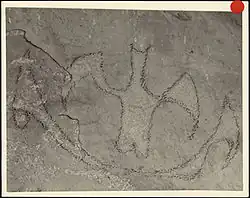 Charcoal drawings can be found on limestone rock shelters in the centre of the South Island, with over 500 sites in the South Island[2] stretching from Kaikōura to North Otago including at the Takiroa Rock Art Shelter. The drawings are estimated to be between 500 and 800 years old, and portray animals, humans and legendary creatures, possibly stylised reptiles.[3] Some of the birds pictured are extinct, including moa and Haast's eagles. They were drawn by Māori, but the meanings of the art is unknown.[4][5] The ink they were drawn with was recorded in the 1920s and included resin and gum from tree's including tarata, and either shark liver oil or weka fat.[5] There are preservation and restoration efforts being made including at 14 limestone caves and overhangs at Ōpihi in South Canterbury.[5] Rock art is also found in the North Island with 140 rock art sites listed with the New Zealand Archaeological Association.[6] Perry Fletchern, historical research consultant expects there believes there are more sites un-discovered on farm land. In general the difference between rock art is that in the North Island there are more carvings and abstract motifs the South Island has more drawings and more figurative forms.[6]