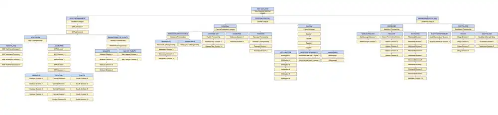 The New Zealand league system is the structure of leagues nationally and regionally, updated for the 2021 season.[1] The system previously had a path from grassroots to the top flight but that stopped in 2004, with the New Zealand Football Championship being created as a replacement to the former New Zealand National Soccer League.