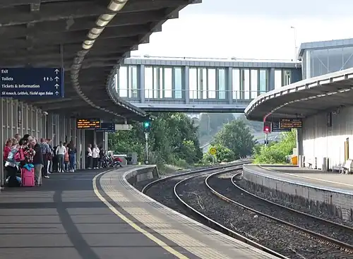 The current station building (constructed in 2009) features 2 platforms that are accessible by a footbridge with lifts and inside the station concourse there is a ticket office and ticket machines, as well as toilets, vending machines and seats. The entrance to the platforms from the station concourse is closed off by a gate which is only opened by staff members around 10 minutes before scheduled departures.