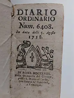 First published in Rome by the Chracas family in 1716, Diario Ordinario, later known as Il Chracas and from 1808 as Diario di Roma, became a significant periodical. Its coverage of political, cultural, and artistic news makes it an essential source for historical research on Rome during this era.[12] Between 1755 and 1797, issues with even numbers featured news from Rome and Italy, while odd-numbered issues contained foreign news. The publication was compact, measuring approximately 12x6 cm, with each issue containing up to 36 pages. The periodicity was irregular, reaching up to three issues per week.