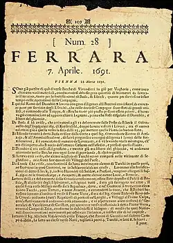 - Ferrara (1691–1722): First printed by Girolamo Filoni in 1691, this newspaper was published three times a week—on Tuesdays, Wednesdays, and Saturdays. By 1702, each issue was sold for two baiocchi (a baiocco being one hundredth of a Roman scudo).[3]: 96
