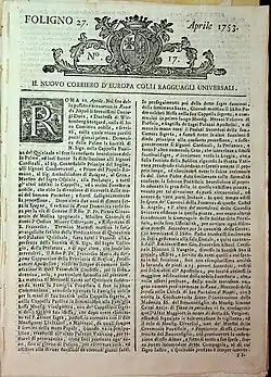 - Corriere Neutrale d'Europa coi Ragguagli Universali (1753–1795): Beginning in 1753, Francesco Fofi published his newspaper Foligno, expanding its title to Il Nuovo Corriere Neutrale d’Europa colli Ragguagli Universali. In 1787, the newspaper dropped the Foligno name and was rebranded as Corriere Neutrale d’Europa coi Ragguagli Universali. The publication, consisting of eight pages in two columns, is particularly notable for its coverage of the French Revolution.[8]
