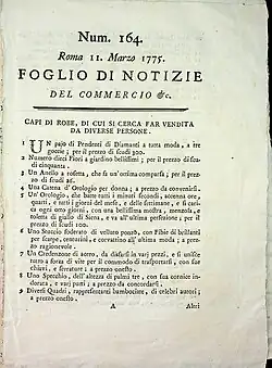 - Notizie del Mondo (1776–1805): In 1776, Francesco Campitelli launched a newspaper with a new format under the title Notizie del Mondo. This publication should not be confused with newspapers of the same name printed in Venezia and Florence. Notizie del Mondo remained in print until at least 1805, though it was less successful than Gazzetta Universale[8][9][i]