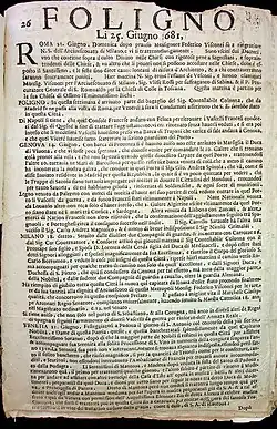 - Mariotti typographers (1680–1707): Antonio Mariotti founded his printing workshop in Foligno in 1677, taking over from the Alterij printers.[6] He successfully obtained a letters patent to operate as the town’s public printer. Expanding his business, Mariotti launched his own newspaper of avvisi, titled Foligno, in 1680. The oldest surviving issue is dated 21 August 1680, held in the Biblioteca Planettiana in Jesi.[7] Mariotti continued publishing the newspaper until 1708. Some issues from 1701 and 1704, as well as the entire 1705 run, were printed in his Spello printshop, managed by his son Gregorio Uboldo, while the editorial office remained in Foligno.[8][f]