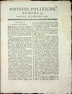 This newspaper marked the beginning of modern political journalism in Rome,[15]: 416 becoming the second newspaper printed in the city. It was in circulation from 2 January 1788 to 28 August 1790 under the full title Notizie politiche: o sia istoria de’ più famosi avvenimenti del mondo. Founded by Francesco Zacchiroli, the newspaper was taken over in 1789 by Francesco Becattini.