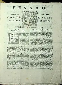The newspaper titled Pesaro, with the additional subtitle Nuove da diverse corti e paesi principali d’Europa, was published in Pesaro by Niccolò Gavelli (1701–1777). [k] The Pesaro newspaper covered news from across Europe while also reporting local affairs.[2] The earliest surviving issue is dated 20 August 1737.[l]
