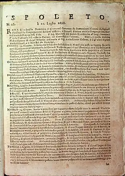 - Spoleto (1688–1728): printed by Giuseppe Giuliani from 1688 to 1706, the newspaper was later continued by Giuseppe Parenti until 1728.[e]