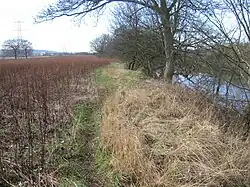 During World War II, an Anti-aircraft battery and associated camp for military personnel known as the 'Whins' or 'Blantyreferme' was set up on open land off the Blantyre Farm Road between Newton and Blantyre, 1.3 miles (2 km) from Newton;[69] the camp was used as emergency accommodation after the conflict, but the huts were later demolished. However, some of the AA battery buildings survived into the 21st century (albeit heavily vandalised in some cases)[70] and were incorporated – along with a former clay quarry nearby – into the landscape of Redlees Urban Park developed by the local council.[71][72]