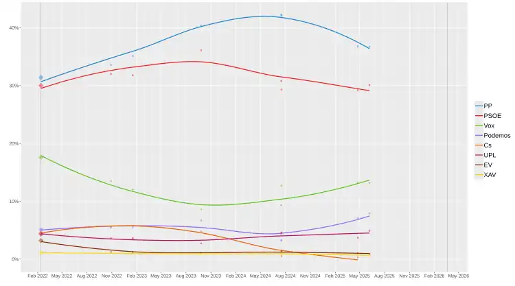 1. ^ "ElectoPanel CyL (31 jul): Mañueco se queda en la absoluta raspada". Electomanía (in Spanish). 31 July 2025.