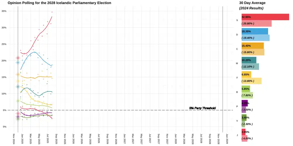 Maskína 4–23 Jul 2025 1,855 31.2 18.0 16.2 6.6 9.9 6.8 2.9 5.0 3.4 13.2