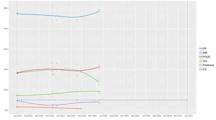 6. ^ "[A] COMUNIDAD DE MADRID. Encuesta SyM Consulting 06/05/2025: PP 52,7% (76), PSOE 16,0% (23), MM-VQ 15,7% (22/23), VOX 9,6% (13/14), PODEMOS-IU-AV 3,4%, CS 0,4%". Electograph (in Spanish). 6 May 2025.