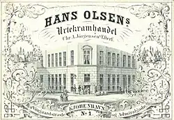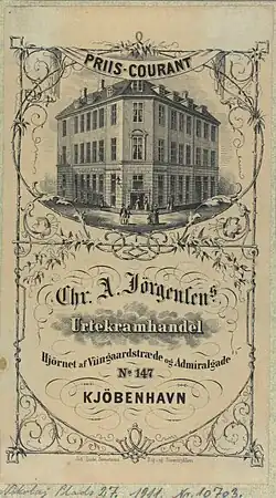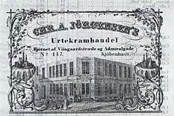 The 71-year-old Dorothea Busck was at the time of the 1850 census still residing in one of the apartments on the second floor. Her grandson Andreas Busck, a son of Gunni Busck, was living there with her.[19] Two of her other grandsons, Georg and Theodor Busck, both law students, were among the residents on the ground floor.[20] The grocer Christian Anthon Jørgensen was together with a couple of employees residing in the other ground floor apartment.[21] He was at the same time operating Cjr. A. Jørgensens Urtekramforretning, a grocery business, in the basement. The now retired pastor Andreas Krog Holm was still residing with his unmarried son and daughter on the first floor.[22] Johannes Emanuel Krieger, a jurist working for the Ministry of Finance, resided with his sister in the other apartment on the first floor.[23] Johan Frederich Holm, who worked in the artillery, resided on the second floor with his wife, five children and mother-in-law.[24]